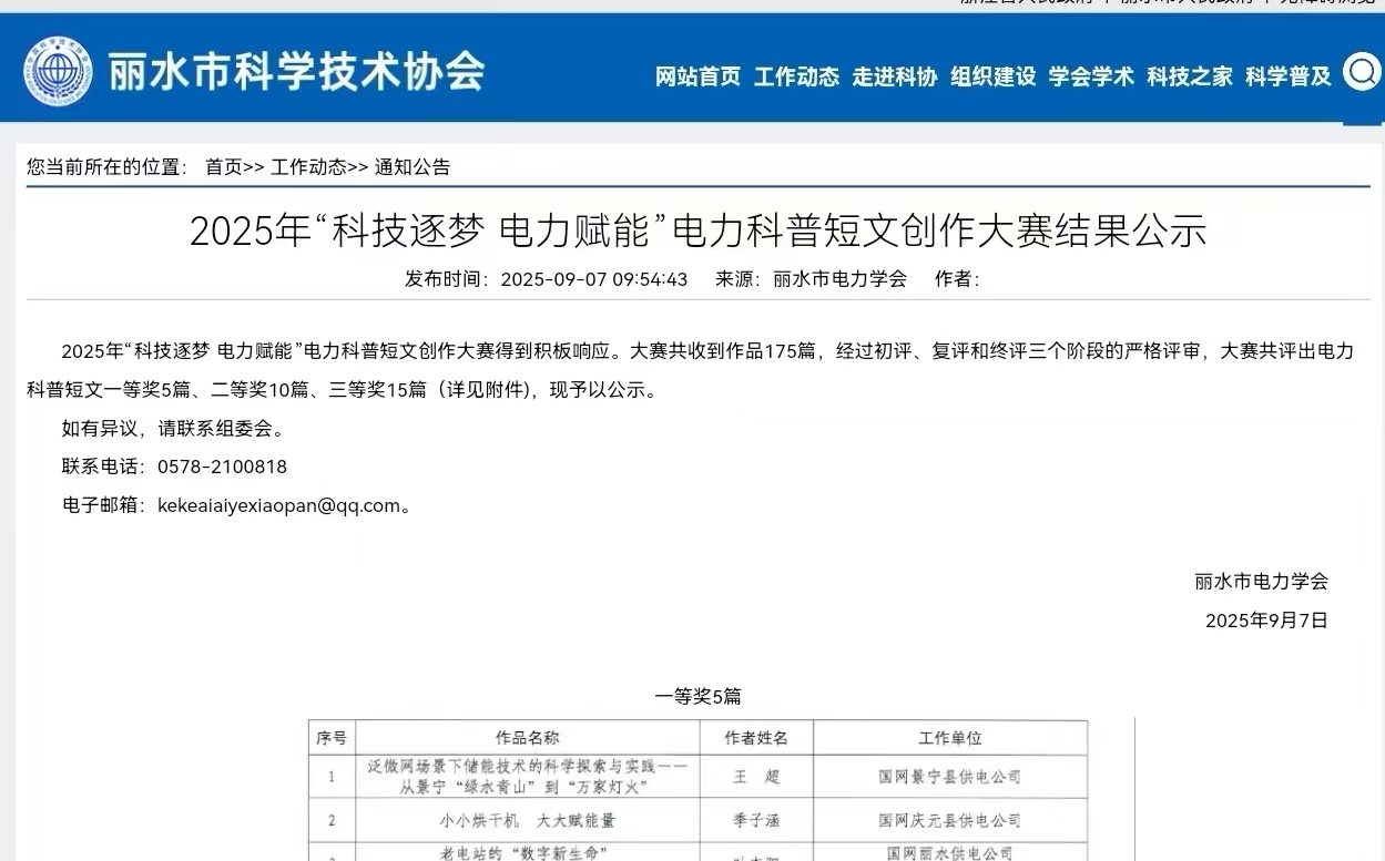 根据2025年全国科普月活动总体安排,丽水电力学会在丽水市科协的指导下举办的2025年“科技逐梦 电力赋能”电力科普短文创作大赛于9月中旬圆满落下帷幕。本次大赛聚焦电力科学知识普及,旨在推动电力科技资源科普转化,提升公众对电力科技发展的认知,大赛共征集到有效参赛作品175篇,得到广大会员单位的积极响应。